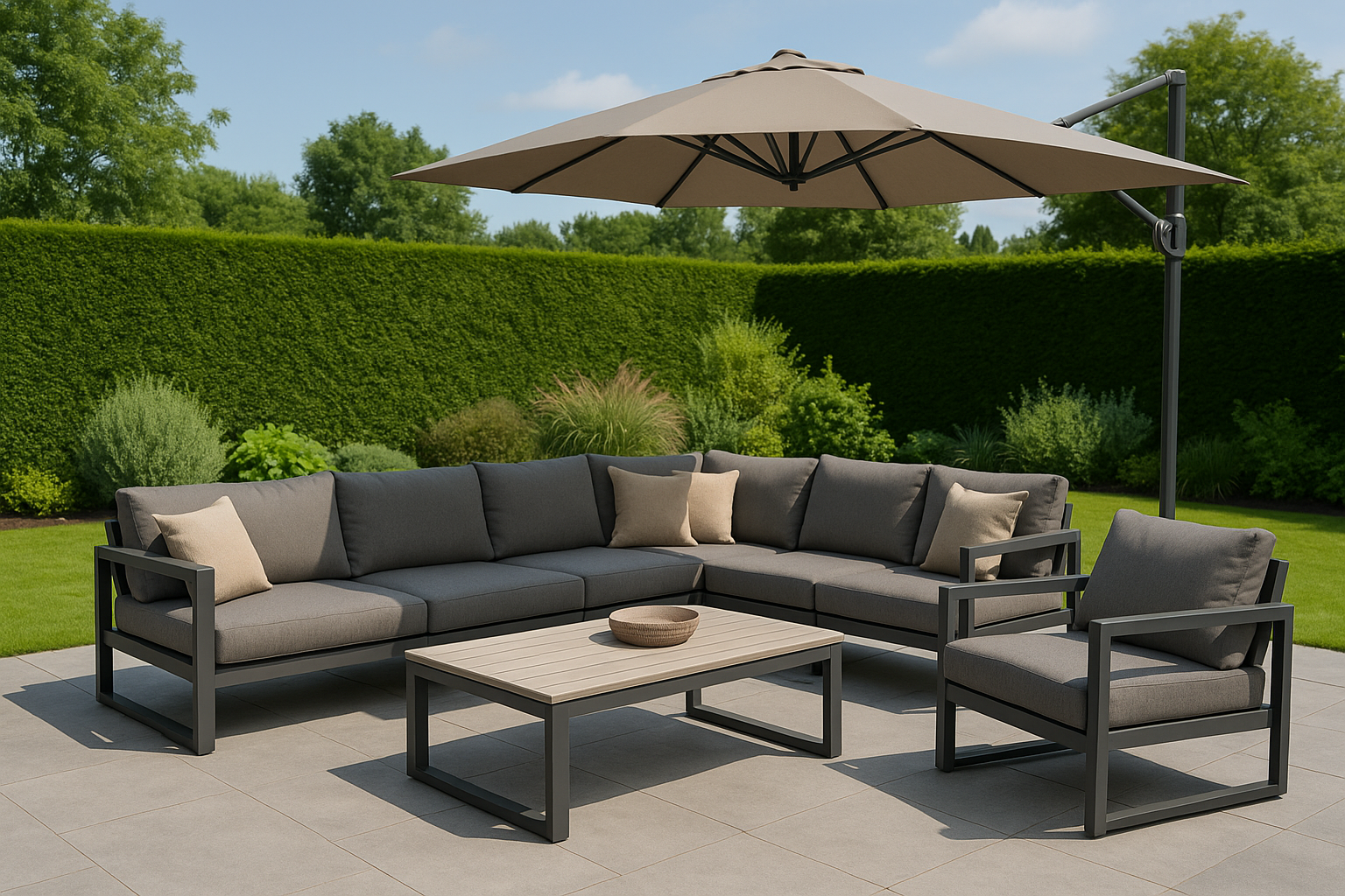 W nowoczesnych projektach ogrodowych bardzo często spotyka się ciemne, eleganckie zestawy w tonacji grafitu lub czerni. Ich największą zaletą jest efekt wizualny – luksusowy, minimalistyczny i bardzo stylowy. Aby jednak były praktyczne, muszą być wykonane z materiałów odpornych na nagrzewanie i blaknięcie.